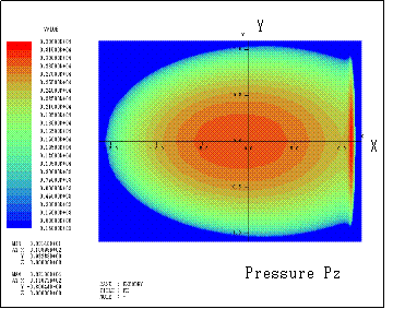 テキスト ボックス: Here, the calculation of the contact pressure by dynamic mesh is shown. Boundary points are moved so as to the pressures become 0 at the points. As a result, the shape of the contact surface is calculated.