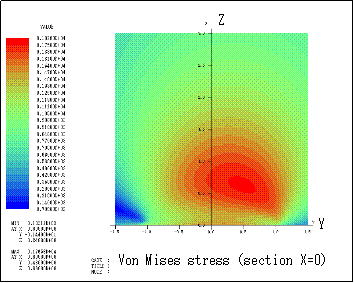 ƒeƒLƒXƒg ƒ{ƒbƒNƒX: The center of Von Mises stress at section X=0 shown right is inclined toward right lower direction because of the friction force.