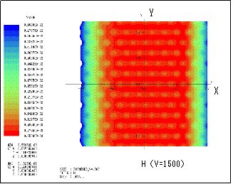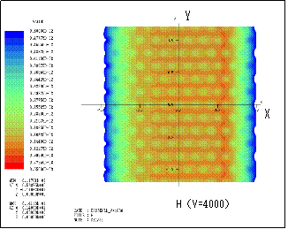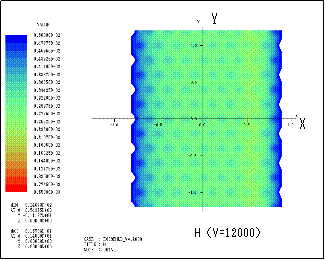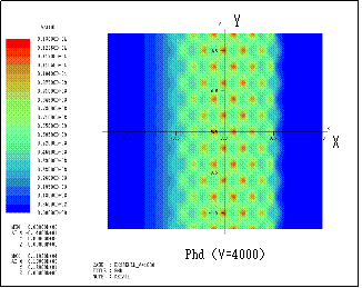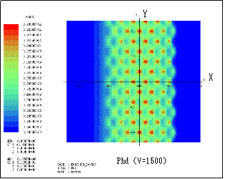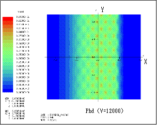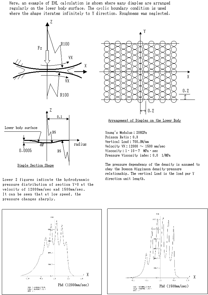 テキスト ボックス: The distribution of hydrodynamic pressure Phd and oil film thickness H at the velocity of 12000, 4000 and 1500 mm/sec are as follows. As the speed becomes slower, the influence of the dimples becomes larger and the film thickness becomes thinner.